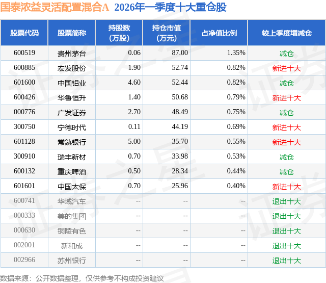 从基金规模来看,国泰浓益灵活配置混合A基金2026年一季度公布的基金规模为0.53亿元,较上一期规模4543.58万元变化了711.0万元,环比变化了15.65%。该基金最新一期资产配置为:股票占净值比8.25%,债券占净值比35.13%,现金占净值比20.22%。从基金持仓来看,该基金当季前十大股票仓位达7.14%,第一大重仓股为贵州茅台(600519),持仓占比为1.35%。