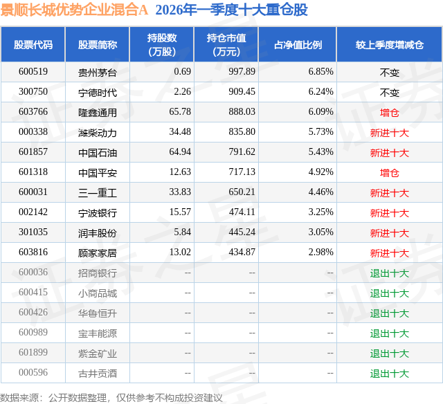 证券之星消息,日前景顺长城优势企业混合A基金公布一季报,2026年一季度最新规模1.45亿元,季度净值涨幅为-3.75%。