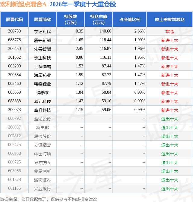 从基金规模来看,宏利新起点混合A基金2026年一季度公布的基金规模为0.4亿元,较上一期规模3556.6万元变化了407.24万元,环比变化了11.45%。该基金最新一期资产配置为:股票占净值比18.69%,债券占净值比31.28%,现金占净值比59.99%。从基金持仓来看,该基金当季前十大股票仓位达15.64%,第一大重仓股为宁德时代(300750),持仓占比为2.36%。