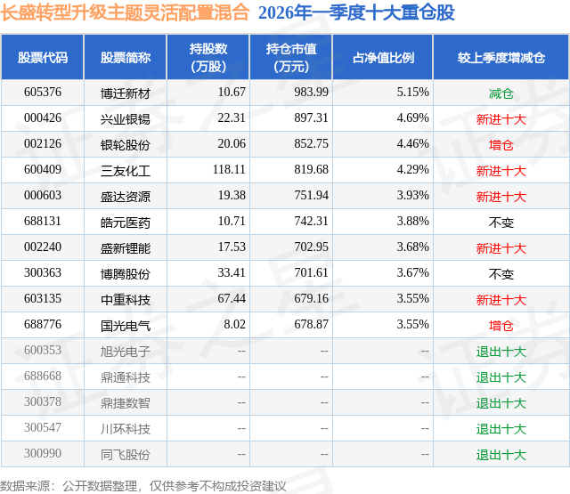从基金规模来看,长盛转型升级主题灵活配置混合基金2026年一季度公布的基金规模为1.91亿元,较上一期规模1.85亿元变化了577.35万元,环比变化了3.11%。该基金最新一期资产配置为:股票占净值比94.15%,债券占净值比2.07%,现金占净值比5.69%。从基金持仓来看,该基金当季前十大股票仓位达40.85%,第一大重仓股为博迁新材(605376),持仓占比为5.15%。