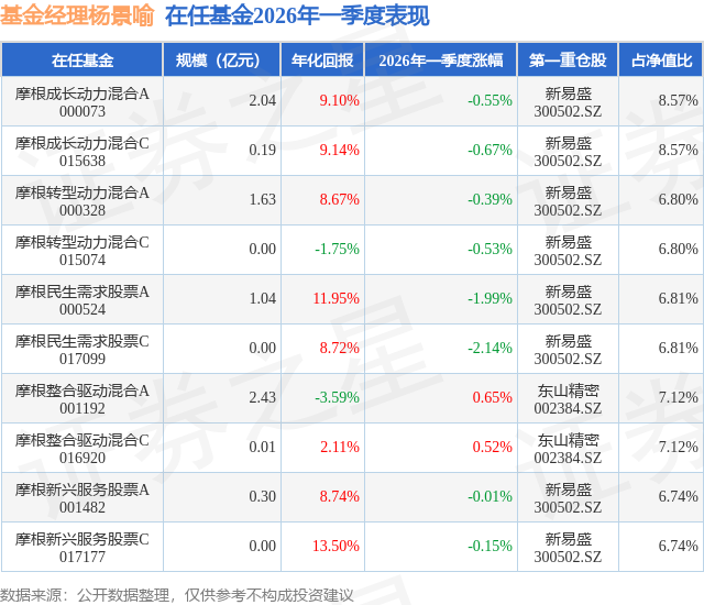 证券之星消息,日前摩根整合驱动混合A基金公布一季报,2026年一季度最新规模2.43亿元,季度净值涨幅为0.65%。