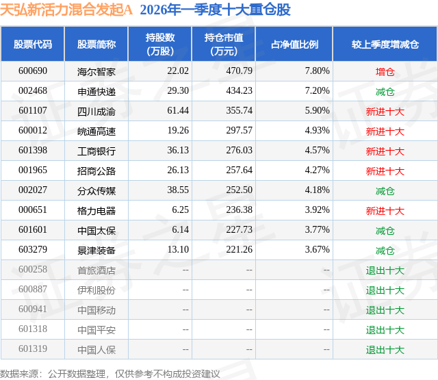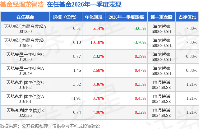 证券之星消息,日前天弘新活力混合发起A基金公布一季报,2026年一季度最新规模0.51亿元,季度净值涨幅为-3.63%。