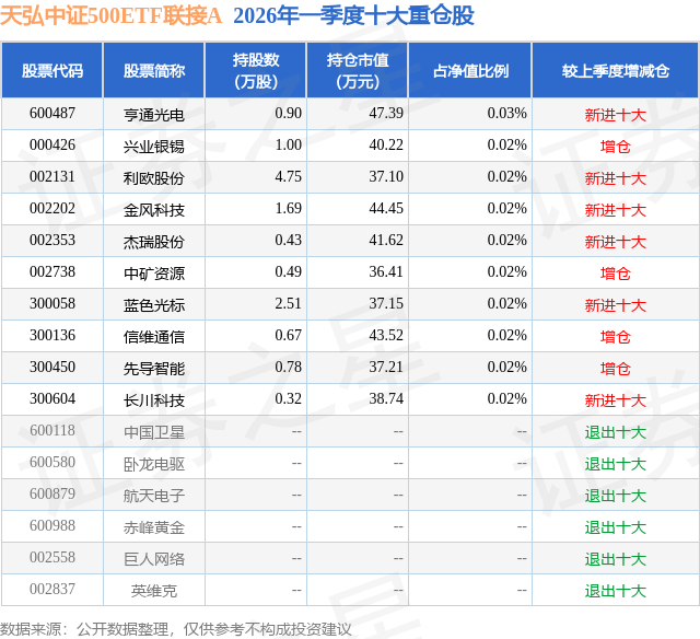 证券之星消息,日前天弘中证500ETF联接A基金公布一季报,2026年一季度最新规模11.79亿元,季度净值涨幅为2.12%。