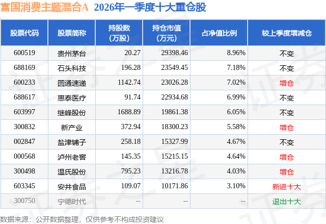 从基金规模来看,富国消费主题混合A基金2026年一季度公布的基金规模为24.64亿元,较上一期规模32.85亿元变化了-8.21亿元,环比变化了-24.99%。该基金最新一期资产配置为:股票占净值比87.54%,无债券类资产,现金占净值比13.62%。从基金持仓来看,该基金当季前十大股票仓位达58.22%,第一大重仓股为贵州茅台(600519),持仓占比为8.96%。