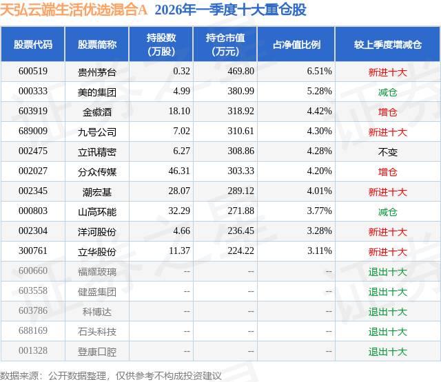 从基金规模来看,天弘云端生活优选混合A基金2026年一季度公布的基金规模为0.72亿元,较上一期规模8948.36万元变化了-1740.87万元,环比变化了-19.45%。该基金最新一期资产配置为:股票占净值比87.18%,无债券类资产,现金占净值比10.26%。从基金持仓来看,该基金当季前十大股票仓位达43.16%,第一大重仓股为贵州茅台(600519),持仓占比为6.51%。