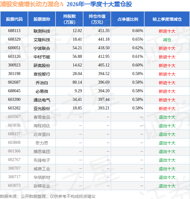 从基金规模来看,浦银安盛增长动力混合A基金2026年一季度公布的基金规模为5.66亿元,较上一期规模5.71亿元变化了-458.79万元,环比变化了-0.8%。该基金最新一期资产配置为:股票占净值比77.24%,无债券类资产,现金占净值比23.56%。从基金持仓来看,该基金当季前十大股票仓位达6.04%,第一大重仓股为联测科技(688113),持仓占比为0.66%。