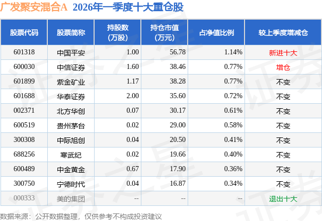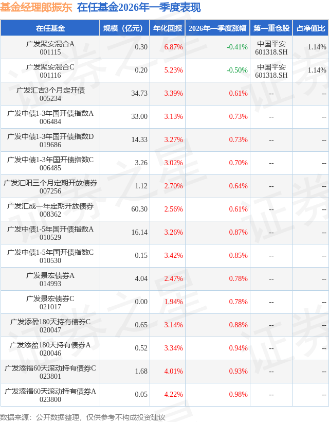 证券之星消息,日前广发聚安混合A基金公布一季报,2026年一季度最新规模0.3亿元,季度净值涨幅为-0.41%。