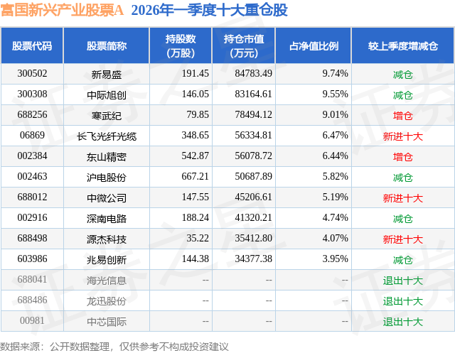 从基金规模来看,富国新兴产业股票A基金2026年一季度公布的基金规模为66.66亿元,较上一期规模31.99亿元变化了34.67亿元,环比变化了108.38%。该基金最新一期资产配置为:股票占净值比88.02%,无债券类资产,现金占净值比10.7%。从基金持仓来看,该基金当季前十大股票仓位达64.98%,第一大重仓股为新易盛(300502),持仓占比为9.74%。