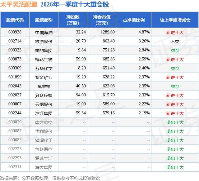 从基金规模来看,太平灵活配置基金2026年一季度公布的基金规模为2.65亿元,较上一期规模6.69亿元变化了-4.05亿元,环比变化了-60.45%。该基金最新一期资产配置为:股票占净值比64.65%,债券占净值比10.29%,现金占净值比2.51%。从基金持仓来看,该基金当季前十大股票仓位达27.48%,第一大重仓股为中国海油(600938),持仓占比为4.87%。