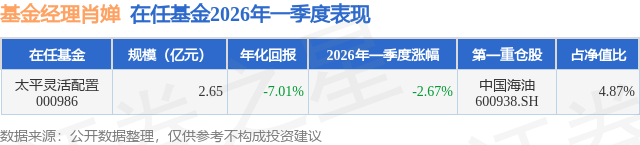 证券之星消息,日前太平灵活配置基金公布一季报,2026年一季度最新规模2.65亿元,季度净值涨幅为-2.67%。