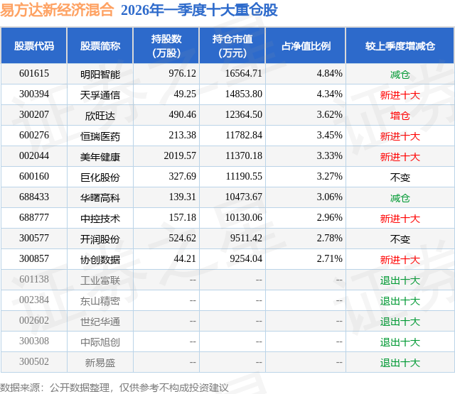 从基金规模来看,易方达新经济混合基金2026年一季度公布的基金规模为34.19亿元,较上一期规模35.35亿元变化了-1.15亿元,环比变化了-3.27%。该基金最新一期资产配置为:股票占净值比80.17%,无债券类资产,现金占净值比18.74%。从基金持仓来看,该基金当季前十大股票仓位达34.36%,第一大重仓股为明阳智能(601615),持仓占比为4.84%。