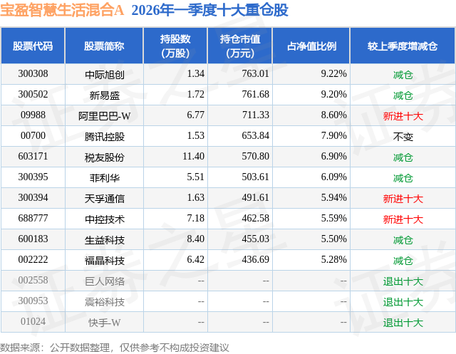 从基金规模来看,宝盈智慧生活混合A基金2026年一季度公布的基金规模为0.53亿元,较上一期规模7006.49万元变化了-1752.89万元,环比变化了-25.02%。该基金最新一期资产配置为:股票占净值比87.25%,无债券类资产,现金占净值比13.02%。从基金持仓来看,该基金当季前十大股票仓位达70.22%,第一大重仓股为中际旭创(300308),持仓占比为9.22%。