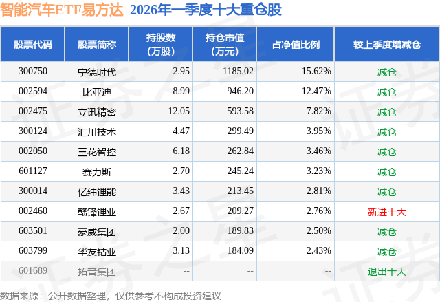 从基金规模来看,智能汽车ETF易方达基金2026年一季度公布的基金规模为0.76亿元,较上一期规模9028.07万元变化了-1439.72万元,环比变化了-15.95%。该基金最新一期资产配置为:股票占净值比99.1%,无债券类资产,现金占净值比0.87%。从基金持仓来看,该基金当季前十大股票仓位达57.05%,第一大重仓股为宁德时代(300750),持仓占比为15.62%。
