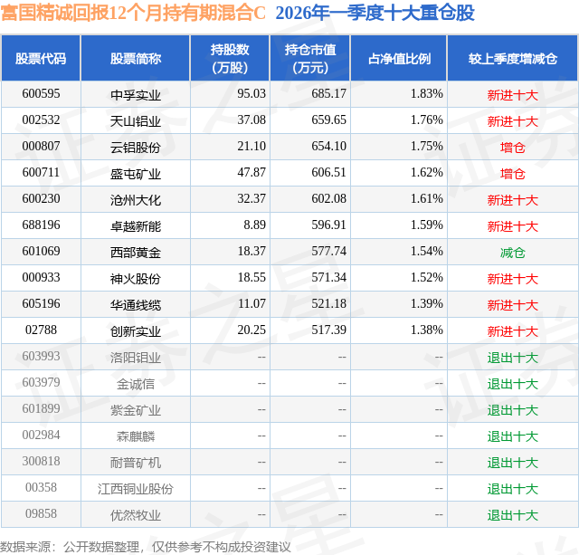 从基金规模来看,富国精诚回报12个月持有期混合C基金2026年一季度公布的基金规模为0.19亿元,较上一期规模3944.41万元变化了-2013.71万元,环比变化了-51.05%。该基金最新一期资产配置为:股票占净值比35.01%,债券占净值比69.61%,现金占净值比2.62%。从基金持仓来看,该基金当季前十大股票仓位达15.99%,第一大重仓股为中孚实业(600595),持仓占比为1.83%。