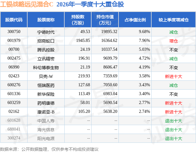 从基金规模来看,工银战略远见混合C基金2026年一季度公布的基金规模为1.58亿元,较上一期规模1.93亿元变化了-3472.88万元,环比变化了-18.04%。该基金最新一期资产配置为:股票占净值比84.85%,无债券类资产,现金占净值比15.44%。从基金持仓来看,该基金当季前十大股票仓位达47.5%,第一大重仓股为宁德时代(300750),持仓占比为9.68%。