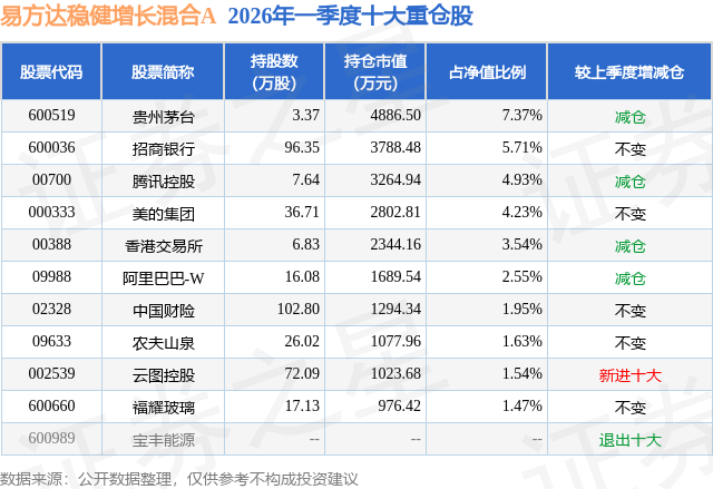 从基金规模来看,易方达稳健增长混合A基金2026年一季度公布的基金规模为6.42亿元,较上一期规模8.77亿元变化了-2.35亿元,环比变化了-26.77%。该基金最新一期资产配置为:股票占净值比45.07%,债券占净值比51.34%,现金占净值比4.39%。从基金持仓来看,该基金当季前十大股票仓位达34.92%,第一大重仓股为贵州茅台(600519),持仓占比为7.37%。