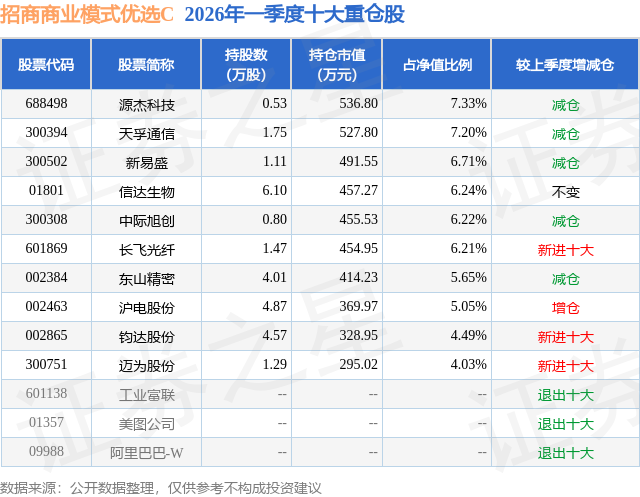 从基金规模来看,招商商业模式优选C基金2026年一季度公布的基金规模为0.08亿元,较上一期规模943.63万元变化了-115.25万元,环比变化了-12.21%。该基金最新一期资产配置为:股票占净值比95.19%,债券占净值比7.66%,现金占净值比2.65%。从基金持仓来看,该基金当季前十大股票仓位达59.13%,第一大重仓股为源杰科技(688498),持仓占比为7.33%。