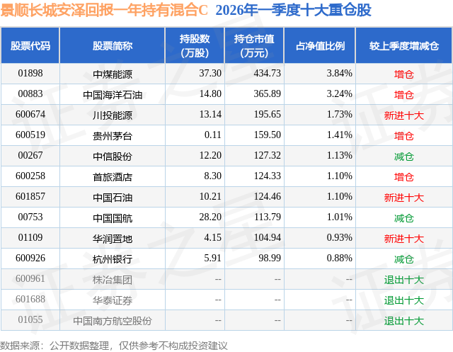 从基金规模来看,景顺长城安泽回报一年持有混合C基金2026年一季度公布的基金规模为0.14亿元,较上一期规模1654.67万元变化了-239.27万元,环比变化了-14.46%。该基金最新一期资产配置为:股票占净值比31.97%,债券占净值比46.95%,现金占净值比7.19%。从基金持仓来看,该基金当季前十大股票仓位达16.37%,第一大重仓股为中煤能源(01898),持仓占比为3.84%。