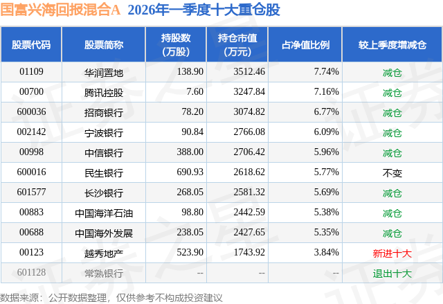 从基金规模来看,国富兴海回报混合A基金2026年一季度公布的基金规模为4.51亿元,较上一期规模12.45亿元变化了-7.94亿元,环比变化了-63.8%。该基金最新一期资产配置为:股票占净值比86.92%,债券占净值比6.69%,现金占净值比6.89%。从基金持仓来看,该基金当季前十大股票仓位达59.75%,第一大重仓股为华润置地(01109),持仓占比为7.74%。