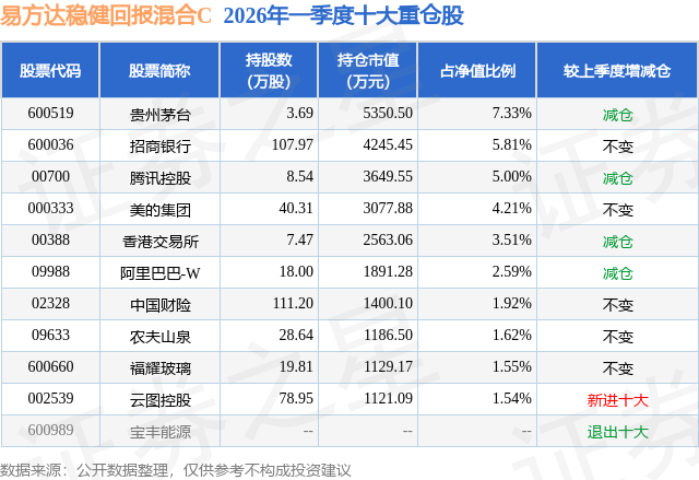 从基金规模来看,易方达稳健回报混合C基金2026年一季度公布的基金规模为0.78亿元,较上一期规模1.04亿元变化了-2573.72万元,环比变化了-24.84%。该基金最新一期资产配置为:股票占净值比45.32%,债券占净值比52.8%,现金占净值比2.09%。从基金持仓来看,该基金当季前十大股票仓位达35.08%,第一大重仓股为贵州茅台(600519),持仓占比为7.33%。