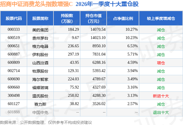 从基金规模来看,招商中证消费龙头指数增强C基金2026年一季度公布的基金规模为9.68亿元,较上一期规模12.79亿元变化了-3.11亿元,环比变化了-24.31%。该基金最新一期资产配置为:股票占净值比94.83%,债券占净值比0.27%,现金占净值比5.03%。从基金持仓来看,该基金当季前十大股票仓位达53.62%,第一大重仓股为美的集团(000333),持仓占比为10.27%。
