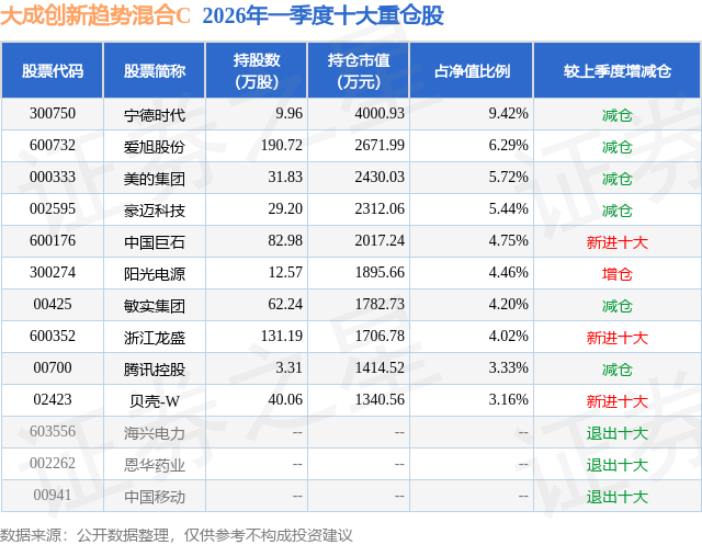 从基金规模来看,大成创新趋势混合C基金2026年一季度公布的基金规模为0.07亿元,较上一期规模906.15万元变化了-207.95万元,环比变化了-22.95%。该基金最新一期资产配置为:股票占净值比85.19%,无债券类资产,现金占净值比13.91%。从基金持仓来看,该基金当季前十大股票仓位达50.79%,第一大重仓股为宁德时代(300750),持仓占比为9.42%。