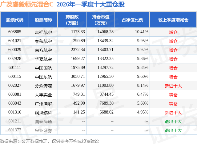 从基金规模来看,广发睿毅领先混合C基金2026年一季度公布的基金规模为4.08亿元,较上一期规模4.39亿元变化了-3141.07万元,环比变化了-7.16%。该基金最新一期资产配置为:股票占净值比94.2%,债券占净值比0.56%,现金占净值比5.7%。从基金持仓来看,该基金当季前十大股票仓位达84.83%,第一大重仓股为吉祥航空(603885),持仓占比为10.41%。