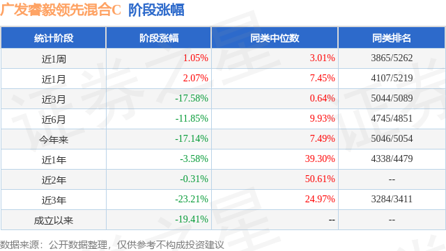 从业绩表现来看,广发睿毅领先混合C基金过去一年净值涨幅为-3.58%,在同类基金中排名4338/4479,同类基金过去一年净值涨幅中位数为39.3%。而基金过去一年的最大回撤为-26.15%,成立以来的最大回撤为-36.75%。