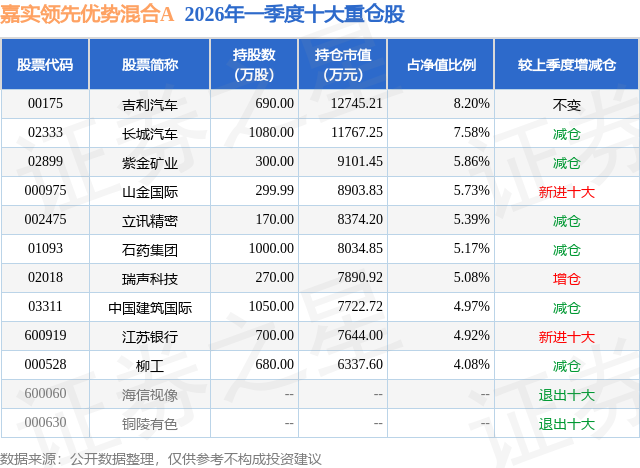 从基金规模来看,嘉实领先优势混合A基金2026年一季度公布的基金规模为15.26亿元,较上一期规模40.58亿元变化了-25.32亿元,环比变化了-62.41%。该基金最新一期资产配置为:股票占净值比91.89%,无债券类资产,现金占净值比8.86%。从基金持仓来看,该基金当季前十大股票仓位达56.98%,第一大重仓股为吉利汽车(00175),持仓占比为8.2%。