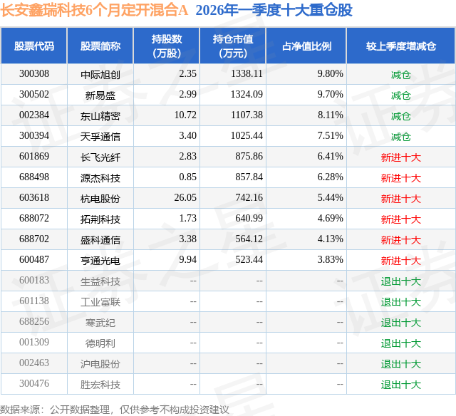 从基金规模来看,长安鑫瑞科技6个月定开混合A基金2026年一季度公布的基金规模为0.95亿元,较上一期规模1.9亿元变化了-9582.73万元,环比变化了-50.3%。该基金最新一期资产配置为:股票占净值比93.97%,无债券类资产,现金占净值比6.21%。从基金持仓来看,该基金当季前十大股票仓位达65.9%,第一大重仓股为中际旭创(300308),持仓占比为9.8%。