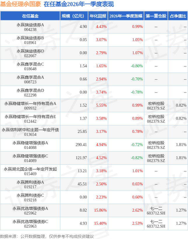 证券之星消息,日前永赢稳健增长一年持有混合E基金公布一季报,2026年一季度最新规模1.37亿元,季度净值涨幅为0.89%。