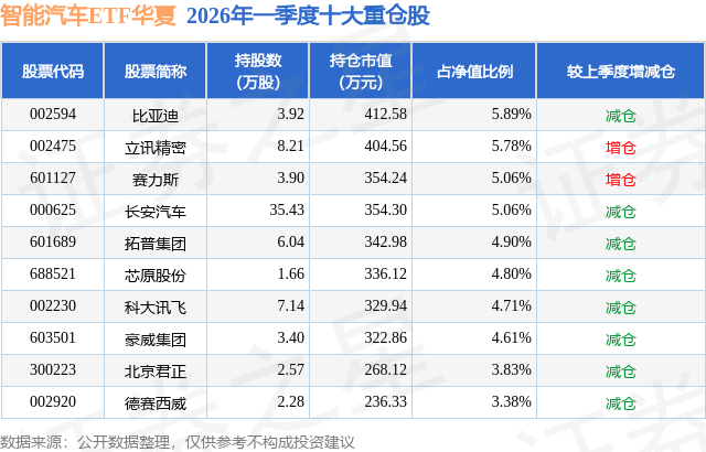 从基金规模来看,智能汽车ETF华夏基金2026年一季度公布的基金规模为0.7亿元,较上一期规模8741.34万元变化了-1741.48万元,环比变化了-19.92%。该基金最新一期资产配置为:股票占净值比99.9%,无债券类资产,现金占净值比0.21%。从基金持仓来看,该基金当季前十大股票仓位达48.02%,第一大重仓股为比亚迪(002594),持仓占比为5.89%。