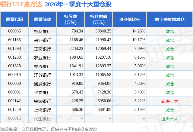 证券之星消息,日前银行ETF易方达基金公布一季报,2026年一季度最新规模21.63亿元,季度净值涨幅为-2.87%。