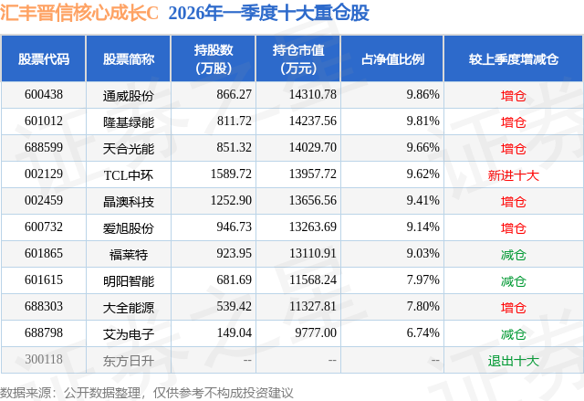 从基金规模来看,汇丰晋信核心成长C基金2026年一季度公布的基金规模为3.76亿元,较上一期规模2.98亿元变化了7802.29万元,环比变化了26.17%。该基金最新一期资产配置为:股票占净值比94.19%,债券占净值比1.55%,现金占净值比4.53%。从基金持仓来看,该基金当季前十大股票仓位达89.04%,第一大重仓股为通威股份(600438),持仓占比为9.86%。
