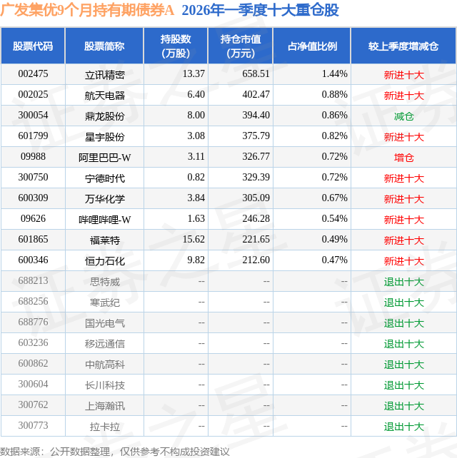 证券之星消息,日前广发集优9个月持有期债券A基金公布一季报,2026年一季度最新规模2.13亿元,季度净值涨幅为-1.66%。