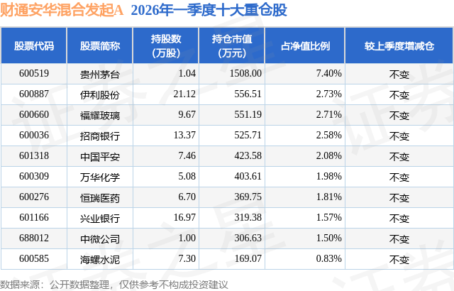 从基金规模来看,财通安华混合发起A基金2026年一季度公布的基金规模为0.1亿元,较上一期规模5035.29万元变化了-4018.92万元,环比变化了-79.82%。该基金最新一期资产配置为:股票占净值比33.31%,债券占净值比53.17%,现金占净值比2.35%。从基金持仓来看,该基金当季前十大股票仓位达25.19%,第一大重仓股为贵州茅台(600519),持仓占比为7.4%。