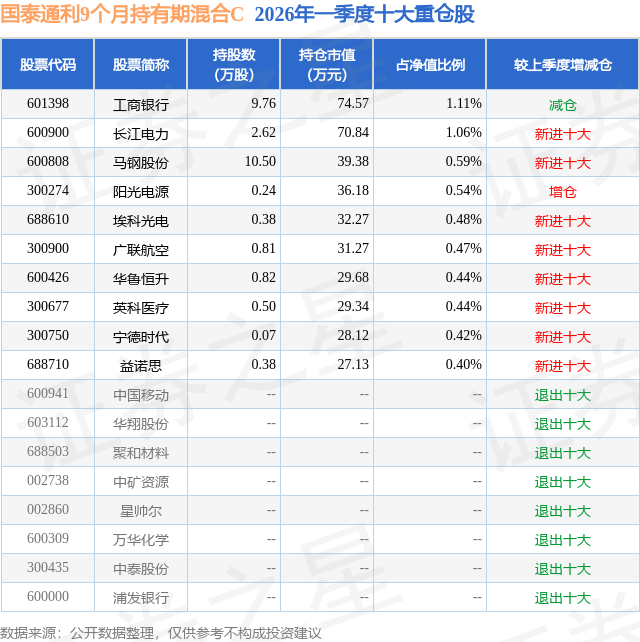 证券之星消息,日前国泰通利9个月持有期混合C基金公布一季报,2026年一季度最新规模0.07亿元,季度净值涨幅为0.3%。