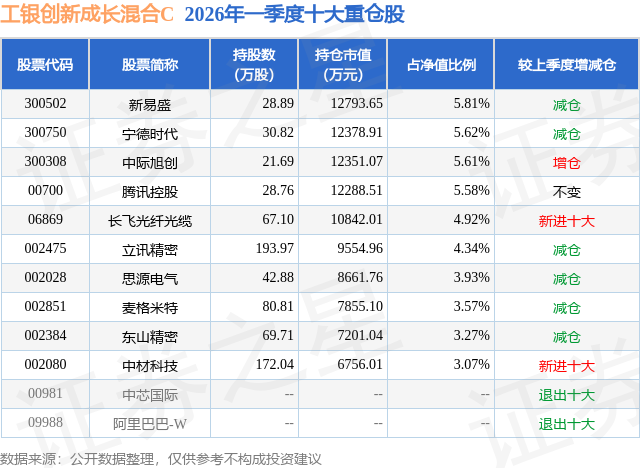 从基金规模来看,工银创新成长混合C基金2026年一季度公布的基金规模为0.99亿元,较上一期规模1.1亿元变化了-1099.23万元,环比变化了-10.03%。该基金最新一期资产配置为:股票占净值比88.81%,无债券类资产,现金占净值比11.41%。从基金持仓来看,该基金当季前十大股票仓位达45.72%,第一大重仓股为新易盛(300502),持仓占比为5.81%。