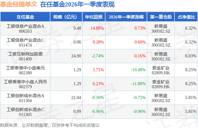 证券之星消息,日前工银创新成长混合C基金公布一季报,2026年一季度最新规模0.99亿元,季度净值涨幅为-0.96%。