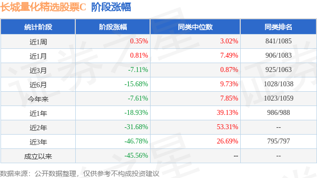 从业绩表现来看,长城量化精选股票C基金过去一年净值涨幅为-18.93%,在同类基金中排名986/988,同类基金过去一年净值涨幅中位数为39.13%。而基金过去一年的最大回撤为-25.08%,成立以来的最大回撤为-59.69%。