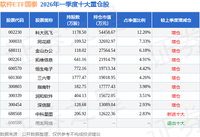 从基金规模来看,软件ETF国泰基金2026年一季度公布的基金规模为44.62亿元,较上一期规模31.83亿元变化了12.8亿元,环比变化了40.21%。该基金最新一期资产配置为:股票占净值比99.63%,无债券类资产,现金占净值比0.43%。从基金持仓来看,该基金当季前十大股票仓位达52.55%,第一大重仓股为科大讯飞(002230),持仓占比为12.2%。
