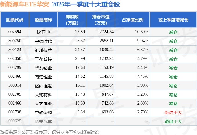 从基金规模来看,新能源车ETF华安基金2026年一季度公布的基金规模为2.57亿元,较上一期规模2.94亿元变化了-3616.77万元,环比变化了-12.32%。该基金最新一期资产配置为:股票占净值比99.19%,无债券类资产,现金占净值比1.02%。从基金持仓来看,该基金当季前十大股票仓位达53.4%,第一大重仓股为比亚迪(002594),持仓占比为10.59%。