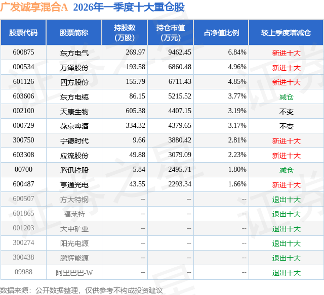 从基金规模来看,广发诚享混合A基金2026年一季度公布的基金规模为12.22亿元,较上一期规模16.11亿元变化了-3.88亿元,环比变化了-24.12%。该基金最新一期资产配置为:股票占净值比83.73%,债券占净值比0.51%,现金占净值比15.73%。从基金持仓来看,该基金当季前十大股票仓位达35.28%,第一大重仓股为东方电气(600875),持仓占比为6.84%。