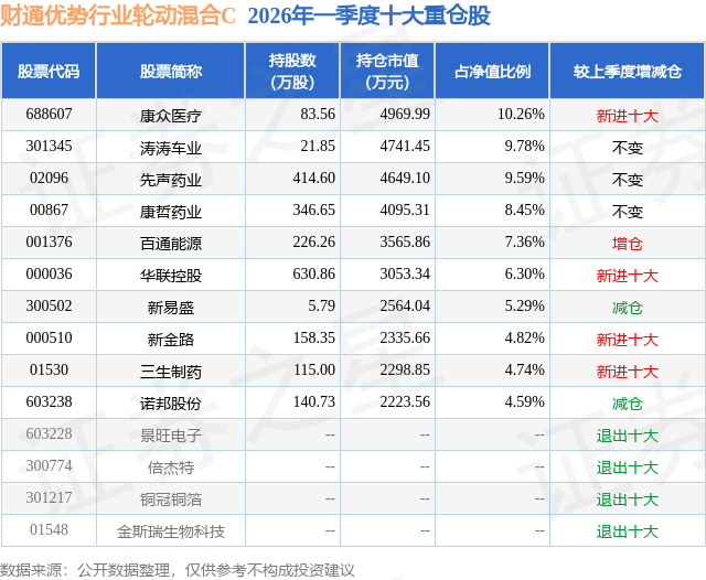 从基金规模来看,财通优势行业轮动混合C基金2026年一季度公布的基金规模为0.17亿元,较上一期规模1921.2万元变化了-228.23万元,环比变化了-11.88%。该基金最新一期资产配置为:股票占净值比94.81%,债券占净值比2.3%,现金占净值比3.27%。从基金持仓来看,该基金当季前十大股票仓位达71.18%,第一大重仓股为康众医疗(688607),持仓占比为10.26%。