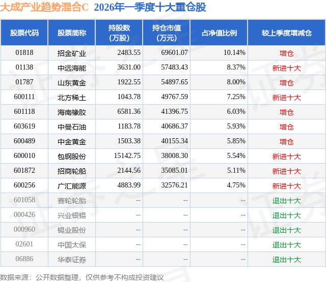 从基金规模来看,大成产业趋势混合C基金2026年一季度公布的基金规模为32.64亿元,较上一期规模2.11亿元变化了30.52亿元,环比变化了1445.18%。该基金最新一期资产配置为:股票占净值比91.25%,无债券类资产,现金占净值比7.41%。从基金持仓来看,该基金当季前十大股票仓位达66.97%,第一大重仓股为招金矿业(01818),持仓占比为10.14%。