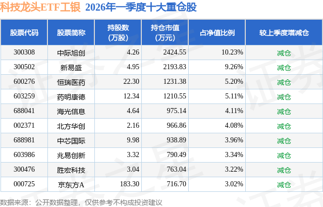 从基金规模来看,科技龙头ETF工银基金2026年一季度公布的基金规模为2.37亿元,较上一期规模3.16亿元变化了-7856.64万元,环比变化了-24.9%。该基金最新一期资产配置为:股票占净值比99.55%,无债券类资产,现金占净值比0.6%。从基金持仓来看,该基金当季前十大股票仓位达51.53%,第一大重仓股为中际旭创(300308),持仓占比为10.23%。