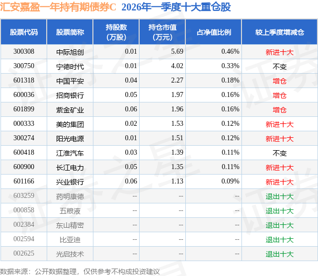 从基金规模来看,汇安嘉盈一年持有期债券C基金2026年一季度公布的基金规模为0.05亿元,较上一期规模639.12万元变化了-169.23万元,环比变化了-26.48%。该基金最新一期资产配置为:股票占净值比12.92%,债券占净值比83.31%,现金占净值比3.89%。从基金持仓来看,该基金当季前十大股票仓位达1.84%,第一大重仓股为中际旭创(300308),持仓占比为0.46%。
