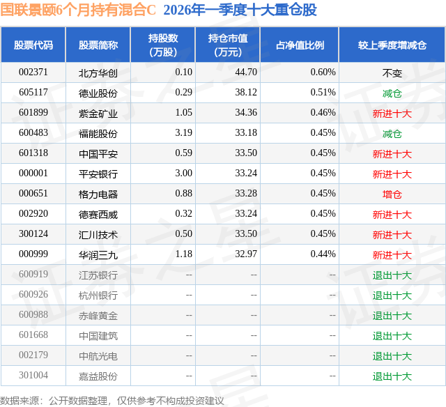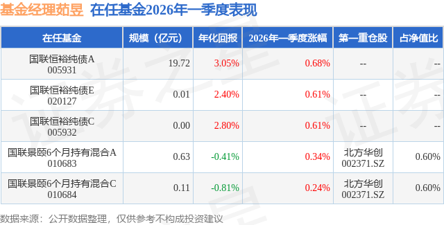 证券之星消息,日前国联景颐6个月持有混合C基金公布一季报,2026年一季度最新规模0.11亿元,季度净值涨幅为0.24%。