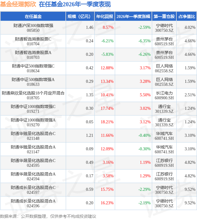 证券之星消息,日前财通智选消费股票C基金公布一季报,2026年一季度最新规模0.24亿元,季度净值涨幅为-6.35%。