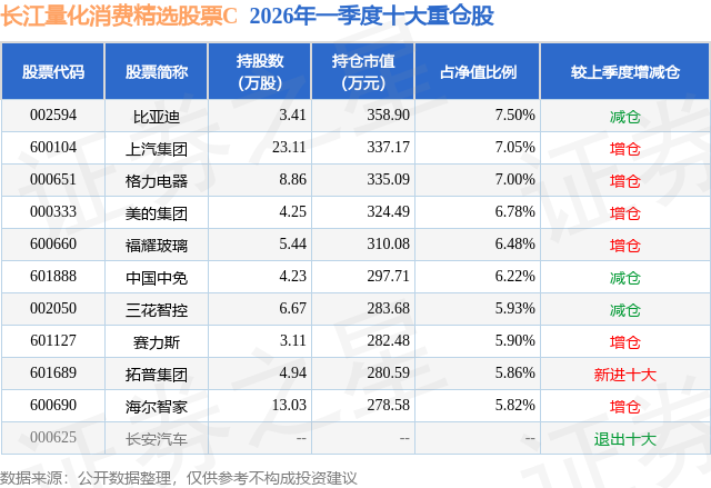 从基金规模来看,长江量化消费精选股票C基金2026年一季度公布的基金规模为0.15亿元,较上一期规模1407.93万元变化了108.24万元,环比变化了7.69%。该基金最新一期资产配置为:股票占净值比92.5%,无债券类资产,现金占净值比7.65%。从基金持仓来看,该基金当季前十大股票仓位达64.54%,第一大重仓股为比亚迪(002594),持仓占比为7.5%。